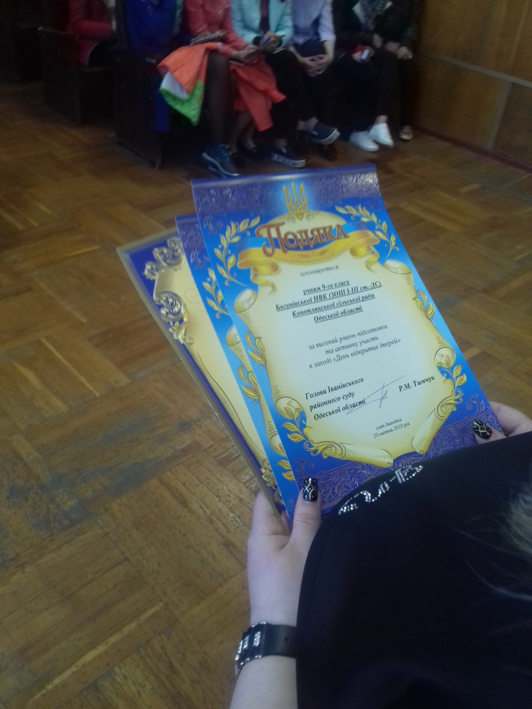 Відкрила захід керівник апарату суду Чернова-Наріжна Оксана Анатоліївна, яка розповіла про історію створення суду, його діяльність, про те, як здійснюється організація роботи апарату Іванівського районного суду Одеської області, які вимоги до працівників та яка відповідальність покладена на них. Також, ознайомила учнів з правилами поведінки в суді та провела гостям невеличку екскурсію судом.
