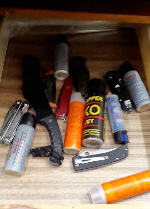 - з боєприпасами, вогнепальною, газовою, пневматичною та холодною зброєю, пристроями для відстрілу патронів, споряджених гумовими чи аналогічними за своїми властивостями метальними снарядами несмертельної дії, балончиками, спорядженими речовиною сльозогінної (сльозоточивої чи дратівної) дії, іншими спеціальними засобами активної оборони;