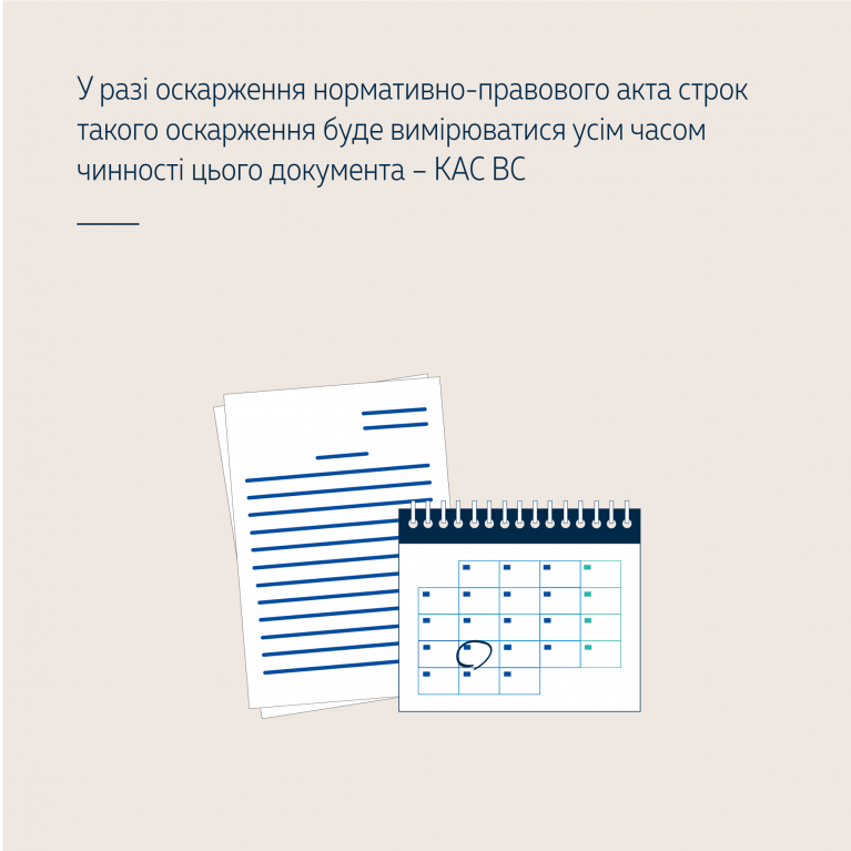 Отже, обчислюючи строк звернення до адміністративного суду з позовом про оскарження нормативно-правового акта, необхідно брати до уваги його багаторазове застосування та триваючу дію (тривала чинність); дійсність факту перебування суб’єкта у відносинах, які регулюються нормативно-правовим актом; дату факту порушення прав, свобод, інтересів, тобто коли саме особа (позивач) дізналася або повинна була дізнатися про порушення своїх прав, свобод чи інтересів; чи є чинним нормативно-правовий акт, яким порушено права, свободи, інтереси особи (позивача); чи перебуває особа (позивач) у правовідносинах, які регулюються нормативно-правовим актом і який оскаржується до адміністративного суду; коли вступила особа (позивач) у правовідносини, які регулюються нормативно-правовим актом, і коли з них вибула.